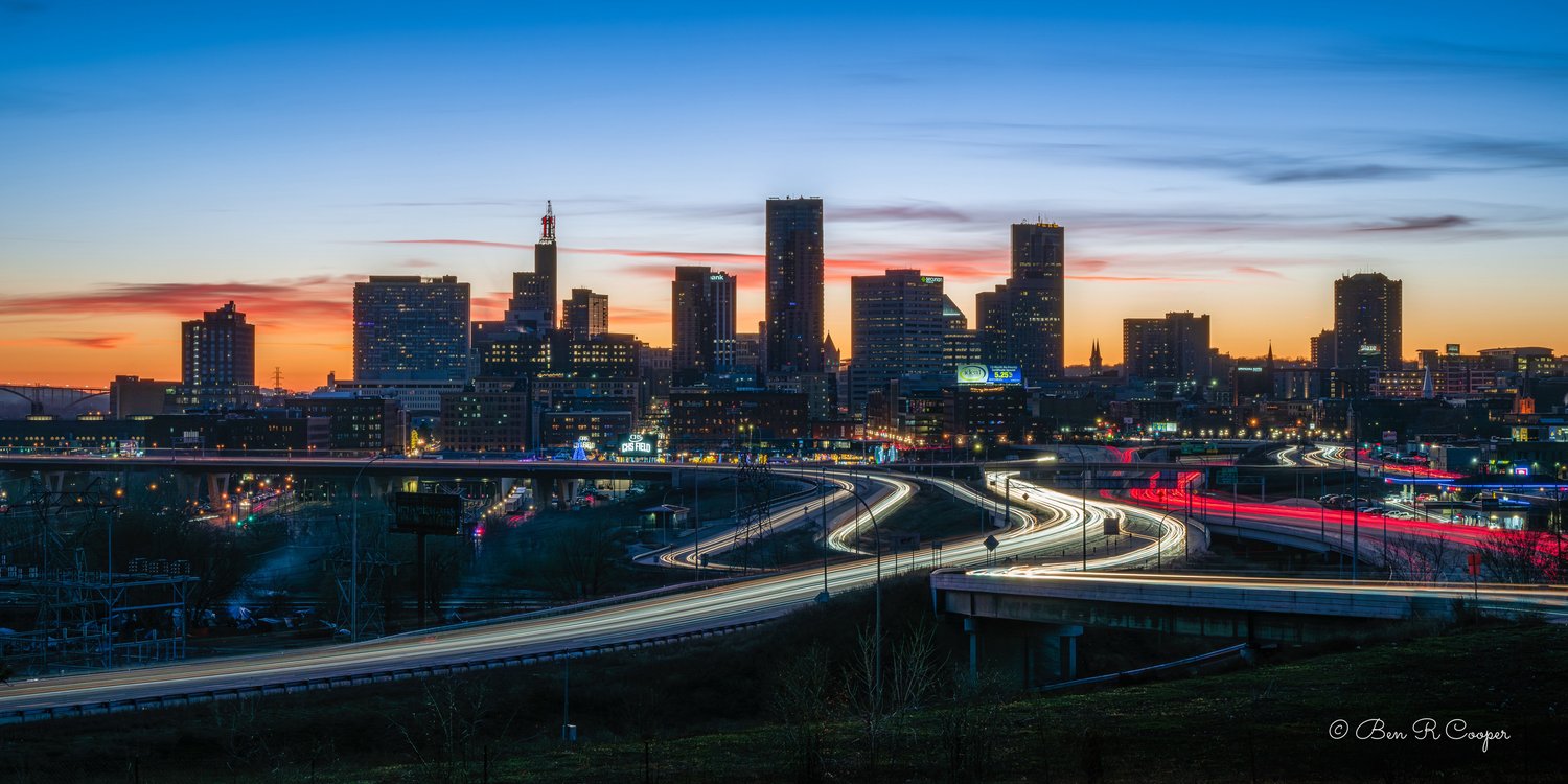 A 60 second exposure of the St Paul, Minnesota skyline, just after sunset (using a 6 stop neutral-density filter to prolong the exposure). As the evening commuters travel through, the headlights and taillights are recorded on the camera sensor as they pass, leaving behind streaking light trails on the recorded image.