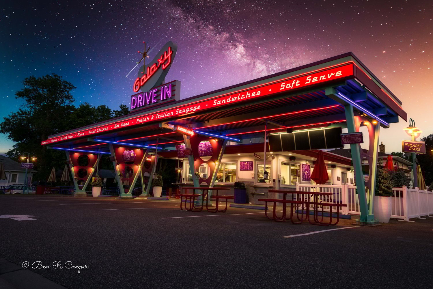 Closed for 5 years, the Galaxy Drive-In in St. Louis Park Minnesota made a triumphant return to business on June 15th, 2020. I blended in a separate photo of the Milky Way galaxy to complete the look and feel I was trying to create - seemed like a perfect fit!