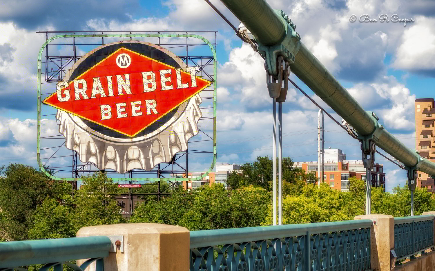 Summertime view of the iconic Grain Belt sign from the Hennepin Avenue bridge in Minneapolis, Minnesota.