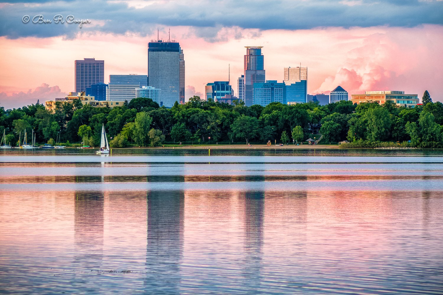 View of Minneapolis across across one of the city's crown jewels: Bde Maka Ska (Lake Calhoun). Taken in 2015, just after sunset on a beautiful summer evening. The last sailboats were headed to shore for the evening.