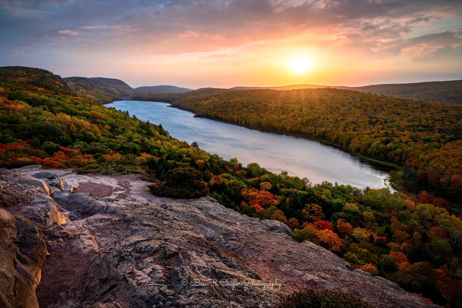 Sunrise skies above "Lake of the Clouds" in the Porcupine Mountains in the Upper Peninsula of Michigan. The bluffs above and around the lake provide for outstanding vantage points. This is an insanely beautiful place to visit in the fall!