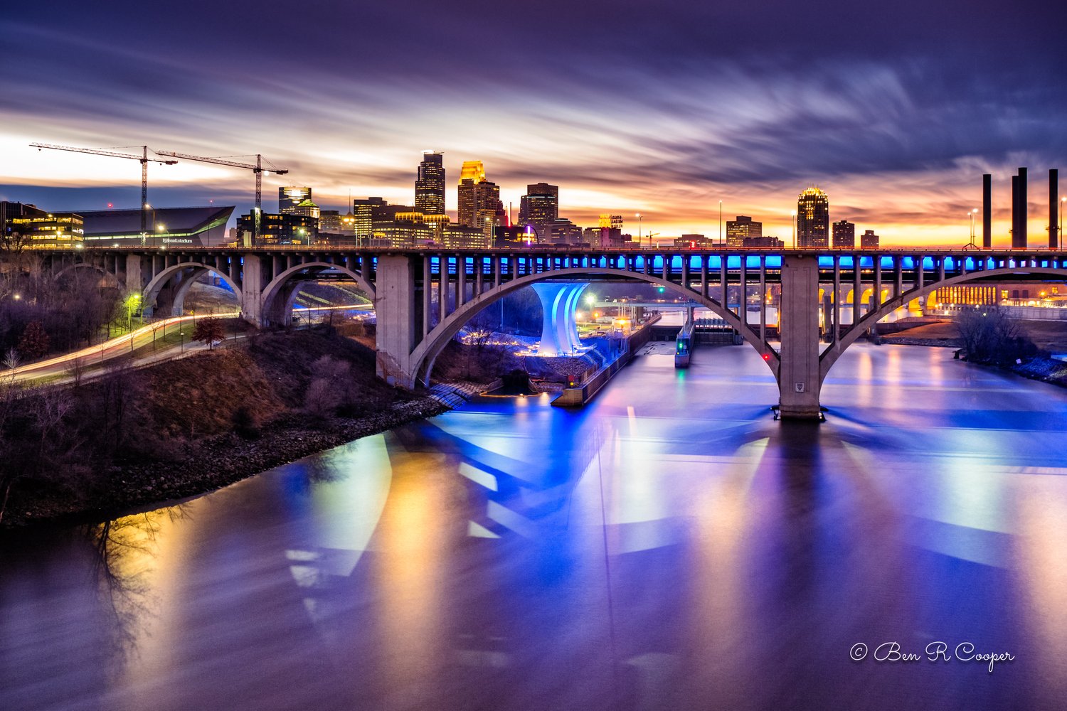 View of the Minneapolis Skyline and the Mississippi River from the Northern Pacific number 9 bridge near the University of Minnesota. This long exposure photograph was captured just after sunset, February 22nd, 2017.