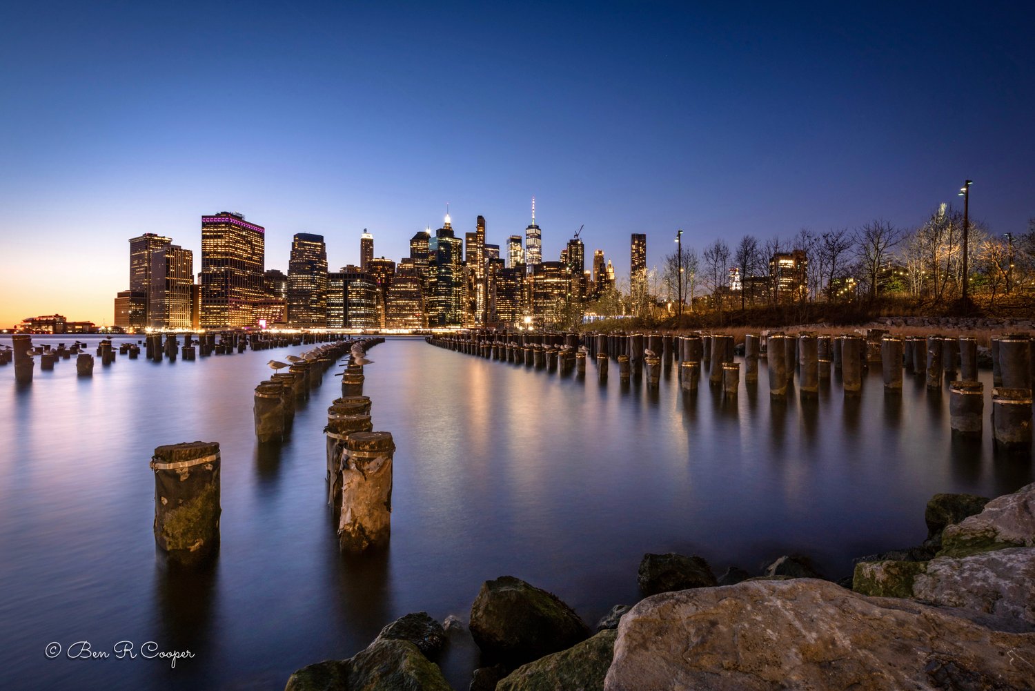 The Manhattan skyline as viewed from Brooklyn across the East River, near the remains of the Old Pier 1.
