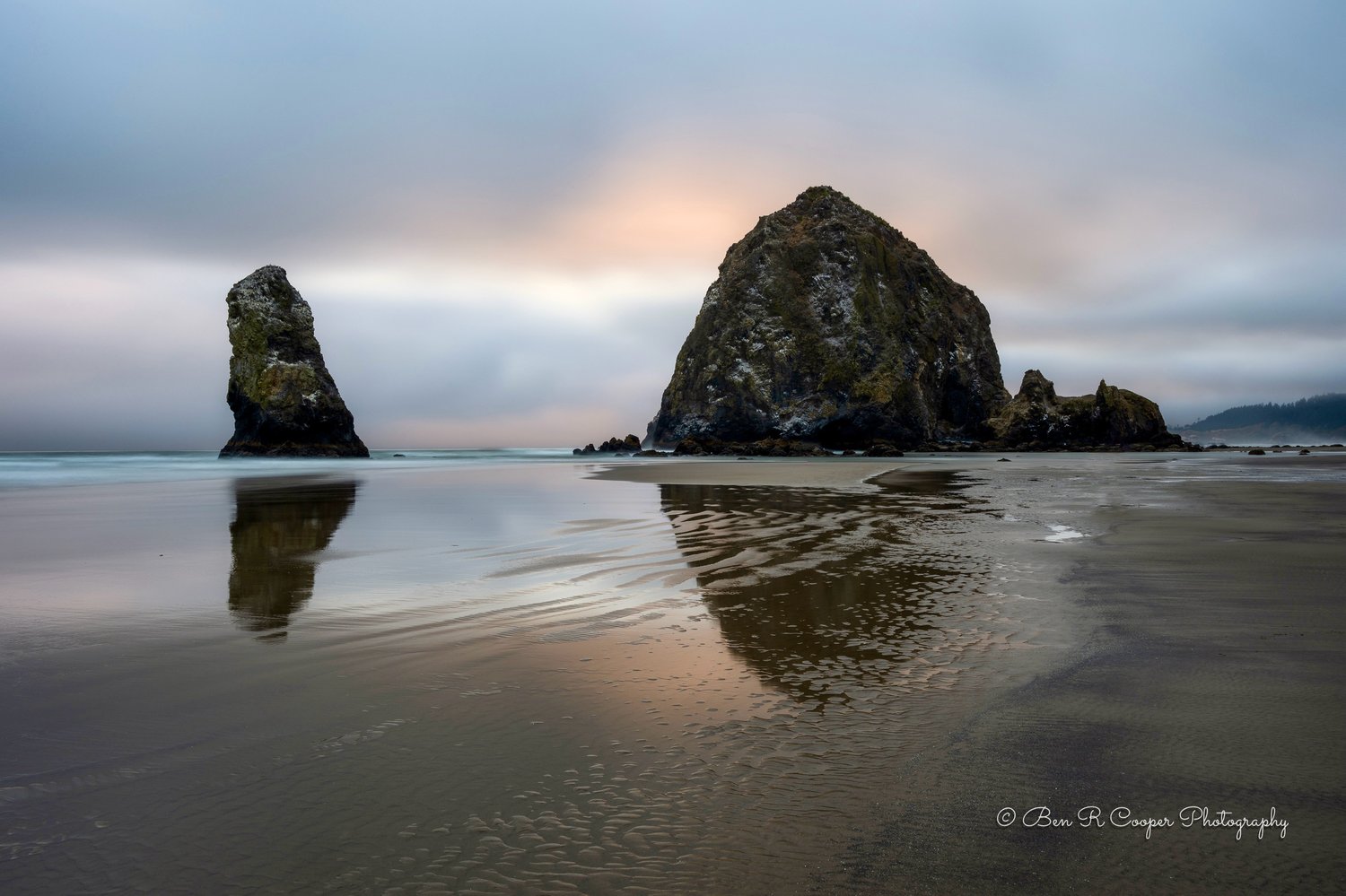 Taken just before sunset with moody clouds and fog rolling through, "Haystack Rock" on the Oregon Coast looked almost otherworldly. Of the several photos I took that afternoon, I especially liked the reflections on the receding water and the muted color palate of this particular shot. Taken August, 2024.