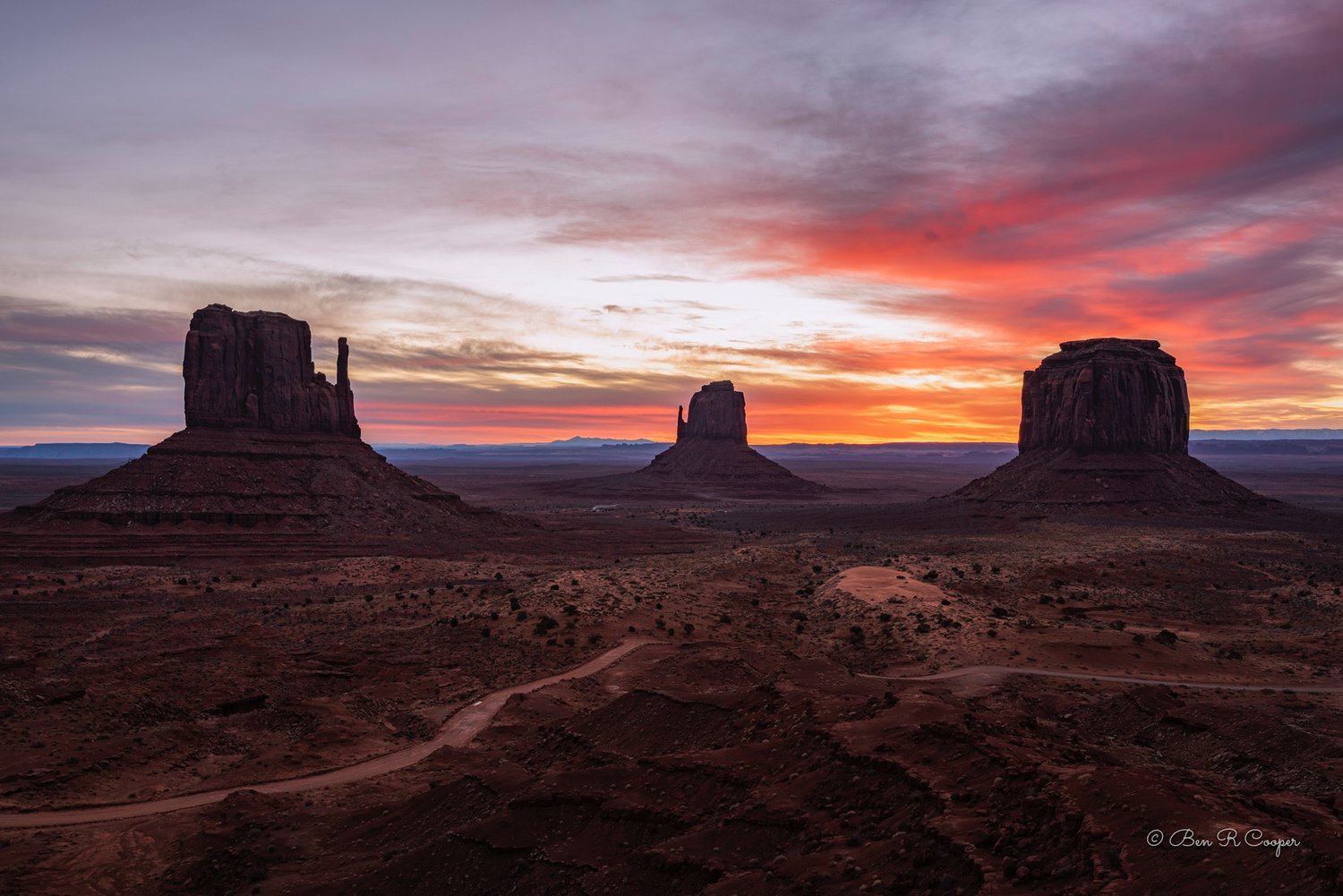 Early morning light and an explosion of pre-dawn color in Utah's Monument Valley. West Mitten, East Mitten and Merrick buttes are featured in this pre-sunrise photo. This one would look stunning as a metal print!