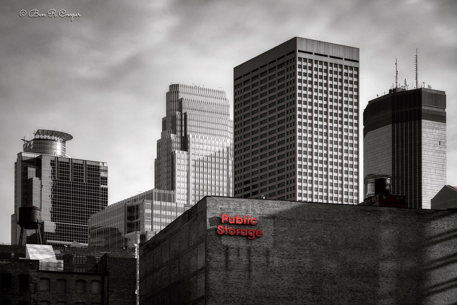 This view of the Minneapolis #skyline got me thinking about the idea that... all buildings, to some degree, are about “public storage”. The whole skyline is “public storage”. Plus I really loved the light, shadows and contrast brought on by the pre-sunset sky, which I felt would work great as a mostly black and white image. Taken in the North Loop neighborhood of Minneapolis, MN February 2021.