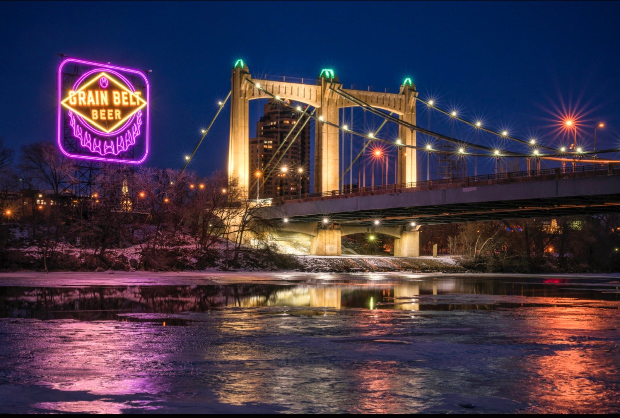 The iconic Grain Belt sign near the Hennepin Avenue bridge in Minneapolis was specially lit purple on this night, reflecting on the semi-frozen Mississippi river below it.