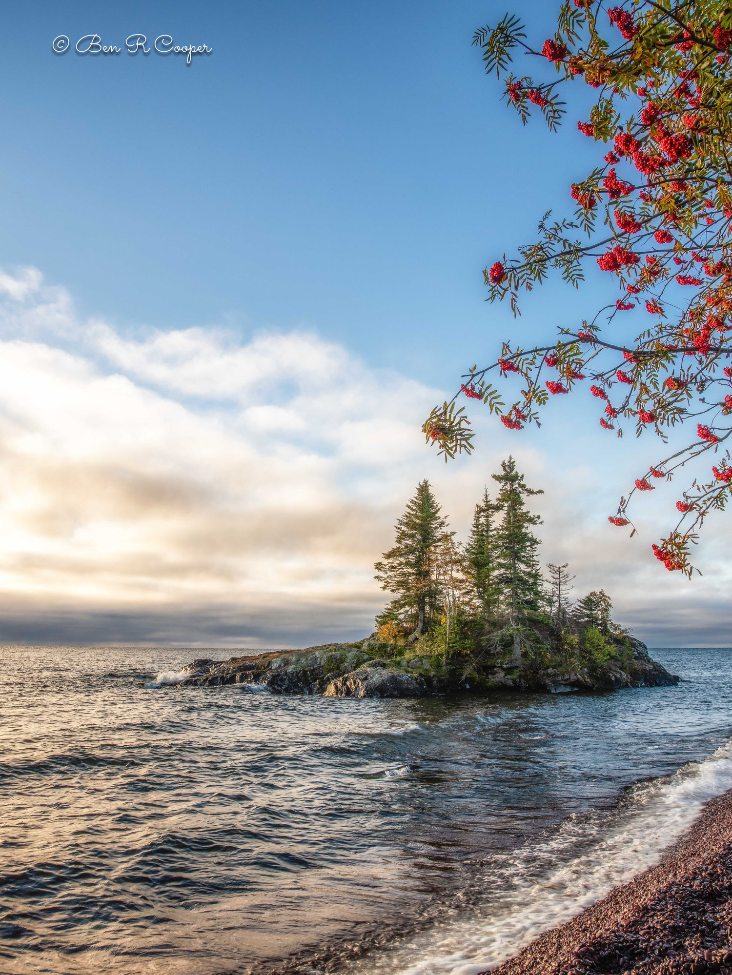 Mountain Ash berries along the North shore of Lake Superior, near Grand Marais, MN. Taken October 6th, 2019. Though not an official name, this little island is nicknamed “The Tombolo”, meaning “island connected to land”, despite the fact it has not been connected to the shore for some time.